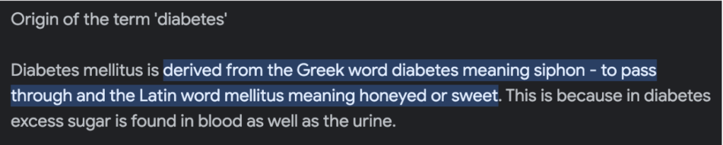 Actually he used the medical lingo “Diabetes Mellitus” and explained that mellitus was Latin for “sweet”.